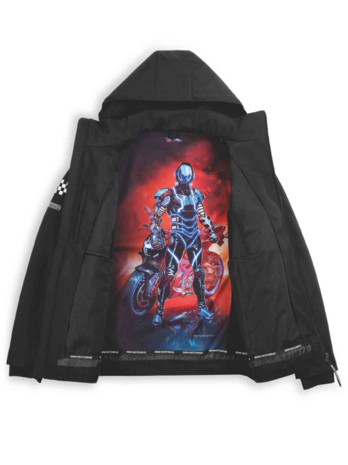 • Grote Motorsport-print links op de borst, o.a. met BMW Motorrad Motorsport-opschrift, “Racing like no other”- opschrift en RR-embleem